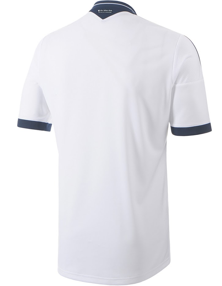 Das neue Schalke 2013-14 Auswärtstrikot basiert auf dem Template von adidas, welches die Grundlage für mehrere andere Trikots einschließlich des Spanien Confed Cup Heimtrikots darstellt. Das Schalke 13-14 Auswärtstrikot kommt überwiegend in Weiß, während der Kragenbereich , die Ärmelenden, die Trikotlogos und die adidas Streifen dunkelblau gehalten sind. Schalkes 13-14 Auswärtshose ist Dunkelblau / Weiß.