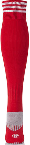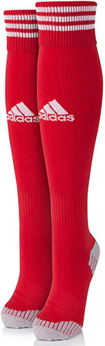 Schwarze Hosen mit weißen Streifen und rote Stutzen komplettieren den traditionellen Look des neuen Adidas Southampton 15-16 Heimtrikots.