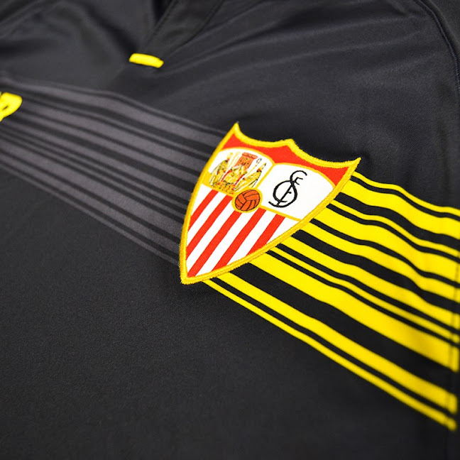 Das schwarze New Balance Sevilla Trikot führt einen frischen Look für die andalusische La Liga Mannschaft ein. Das neue Sevilla 15-16 Trikot kombiniert die Hauptfarbe Schwarz mit einem auffälligen gelb / dunkelgrauen horizontalen Streifendesign auf der Vorderseite, während die Rückseite des Trikots völlig schwarz ist.