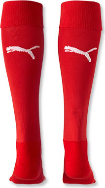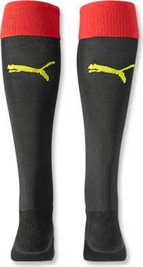 Die Stuttgart 15-16 Trikot-Hose ist schwarz mit einem gelben Puma Logo und einem roten Einsatz, während die Stutzen ebenfalls schwarz mit einem roten Streifen sind.