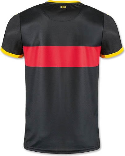 Das neue VfB Stuttgart 15-16 Trikot, das hauptsächlich schwarz ist, kommt mit auffälligen gelben Details in Form des V-Kragens, der Ärmelenden und des Puma Logos auf der Vorderseite. Ein roter Brustring verläuft um das gesamte neue Stuttgart Trikot, das ein helles Gelb für die Namen und Nummern aufweist.