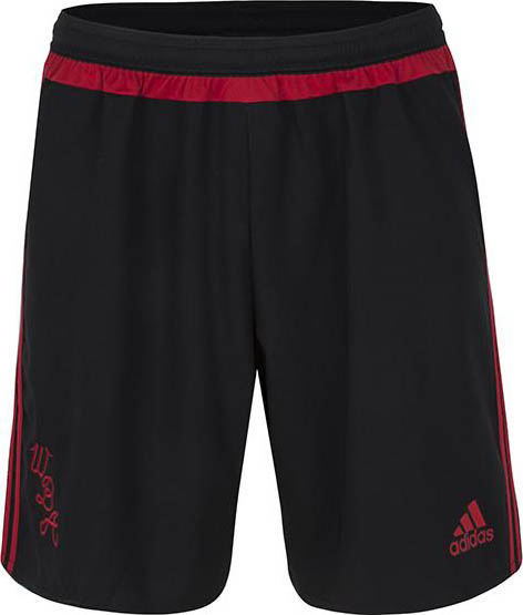 Schwarze Hosen mit roten drei Streifen und schwarze Stutzen komplettieren das auffällige Design des neuen Adidas West Bromwich Albion 15-16 Trikots.