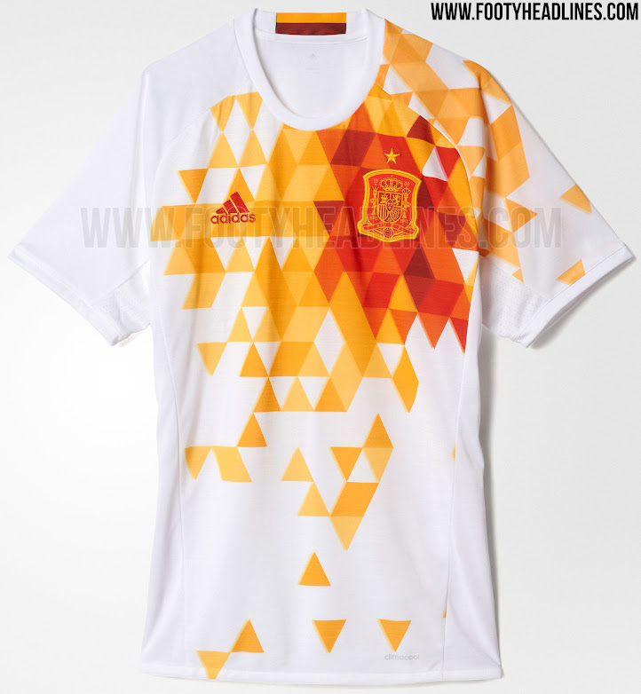 Das neue Spanien EM 2016 Auswärts-Trikot, das in krassem Gegensatz zu dem Spanien EM 2016 Heim-Trikot steht, weist eine noch nie zuvor gesehene, ins Auge springende Grafik auf der Vorderseite auf. Erneut beinhaltet die Grafik mehrere Dreiecke, die von der "Leidenschaft des spanischen Fußballs" inspiriert wurden - dieses Mal in unterschiedlichen roten und gelben Formen, inmitten dessen sich das Verbandswappen, das Zentrum, befindet.