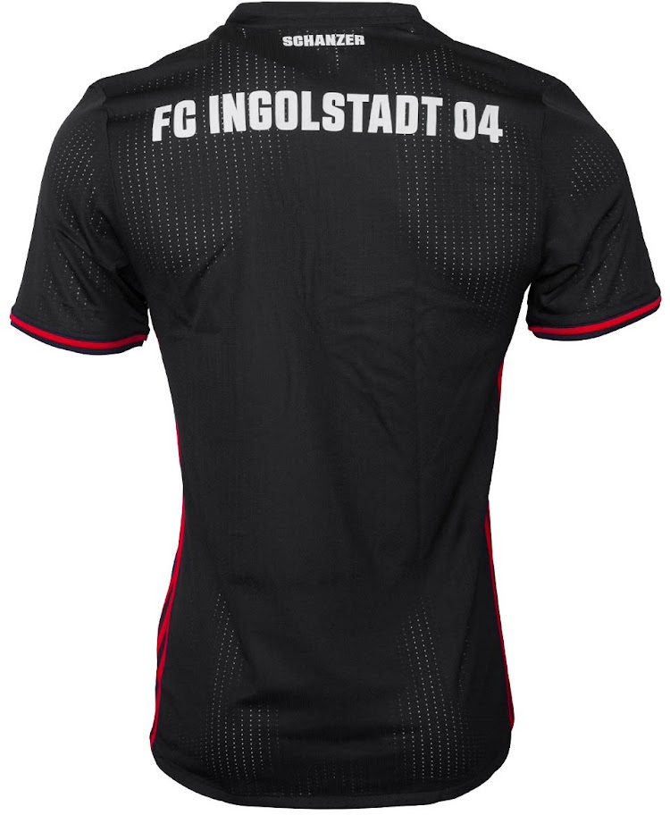 Das Ingolstadt 2016-17 Trikot ist schwarz mit einem roten V auf der Vorderseite. Es hat einen einzigartigen Kragen, rote Details auf den Ärmelenden und rote drei Streifen, die auf der Seite des Trikots verlaufen.