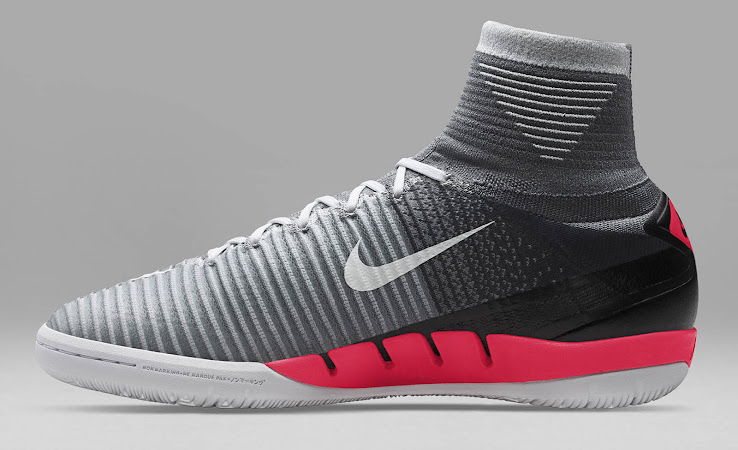 Die Nike MercurialX Proximo Air Max Heritage Fußballschuhe, die möglicherweise die schärfsten der Kollektion sind, kombinieren die unauffälligen Farben Grau und Schwarz mit gewagten pinken Applikationen.