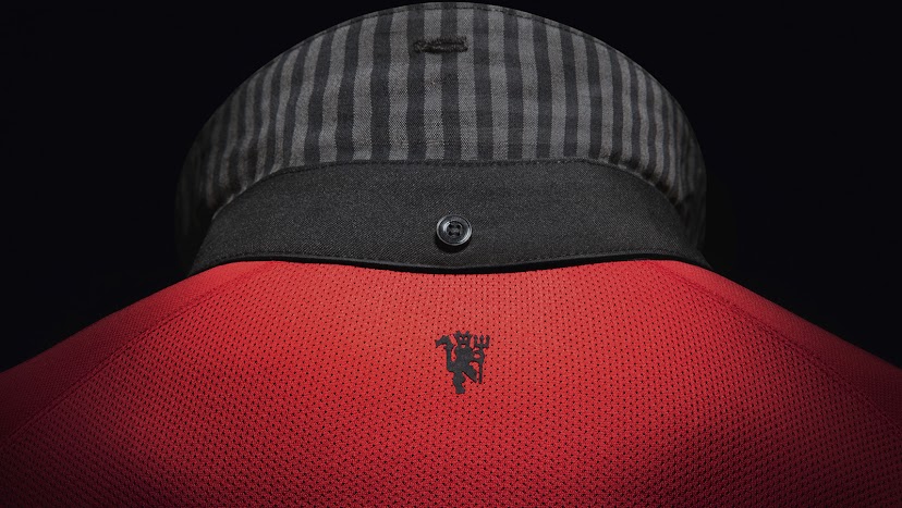 Das neue Manchester United 2013-14 Heimtrikot kommt on der traditionellen roten Farbe der Red Devils mit einem schwarzen Kragen.