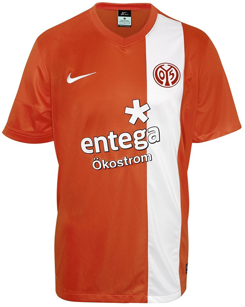 Die Mainz 2013-14 Trikots von Nike - Die neuen Mainz Trikots basieren zwar grob auf Teamwear-Templates, der FSV Mainz hat allerdings eigene Farbvariationen der Teamwear Modelle erhalten. Das Mainz 13-14 Heimtrikot und Auswärtstrikot tragen das Sponsorenlogo von Entega Ökostrom.
