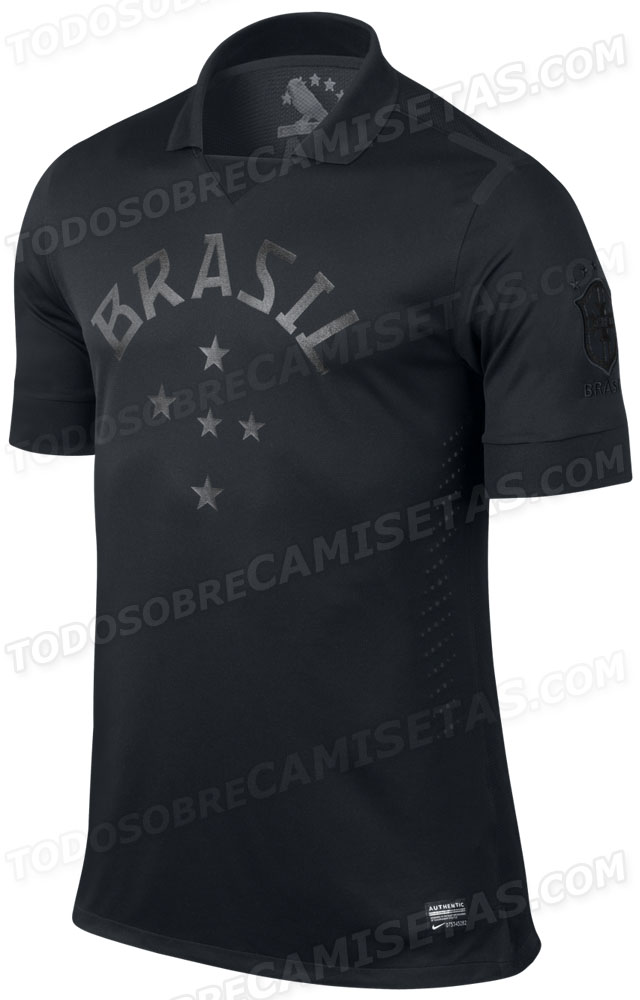 Das Nike Brasilien schwarze Ausweichtrikot wurde geleaked. Das neue Brasilien 2013 Ausweichtrikot kommt im selbem Template wie das jetzige Brasilien Heimtrikot und besitzt dunkelgraue Appikationen auf einem ganz schwarzen Trikot. Der Schriftzug Brazil verziert die Vorderseite und die fünf Sterne erinnern an die bereits gewonnenen Weltmeisterschaftstitel. Auf dem Trikot ist weder ein Nike Logo noch das Brasilien Wappen, die sich stattdessen auf beiden Ärmeln befinden.