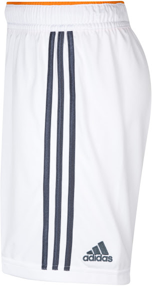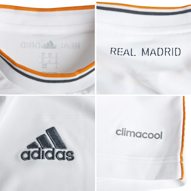 Das Real Madrid 13-14 Heimtrikot ist weiß mit schwarzen Adidas Streifen und orangenen Details. Der Kragen des neuen Real Madrid 2013-14 Trikots ist orange / weiß / schwarz genauso wie die Ärmelenden. Das Sponsorenlogo von Fly Emirates ist schwarz und auf der Vorderseite des Trikots sind kleine glänzende horizontal verlaufende Nadelstreifen. Das neue Real Madrid 2013-14 Heimtrikot wird heute offiziell präsentiert.