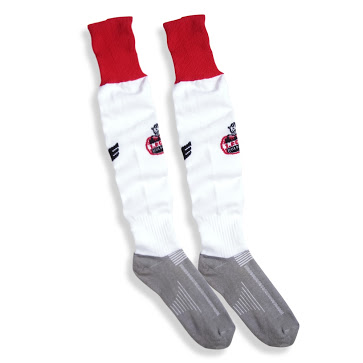 Die FC Köln 2013-14 Heimtrikotstutzen sind Weiß mit einem rotem Teil. Auf der Vorderseite der neuen Stutzen ist das Wappen des 1. FC Köln, auf der Rückseite ist das Logo von Erima.