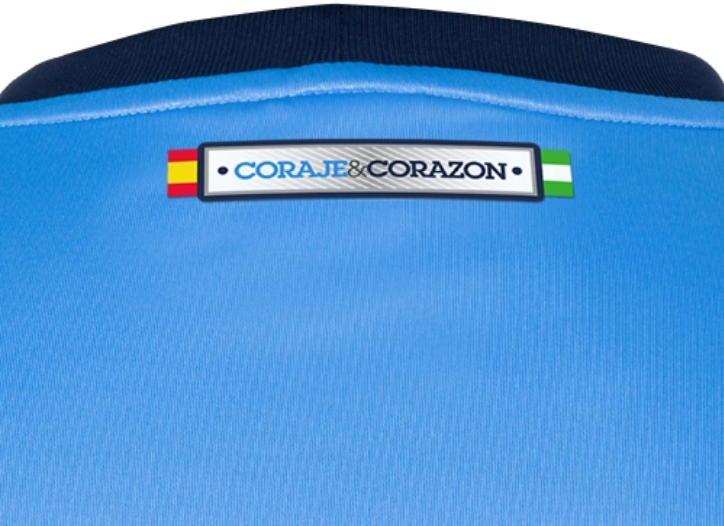 Die Málaga 13-14 Trikots werden von Nike hergestellt während der Klub weiterhin das Unesco Logo auf der Vorderseite hat um die UN Agentur zu unterstützen. Die neuen Málaga Trikots haben auch den Schriftzug 'Coraje y corazón' ('Kourage und Herz') auf der Rückseite unter dem Kragen platziert.
