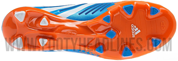Die Sohle der blauen Adidas Predator LZ II Farbvariante ist orange mit blauen und weißen Stollen.