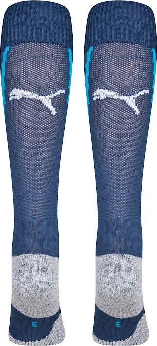 Die Hose und die Stutzen des Trikots sind hellblau.