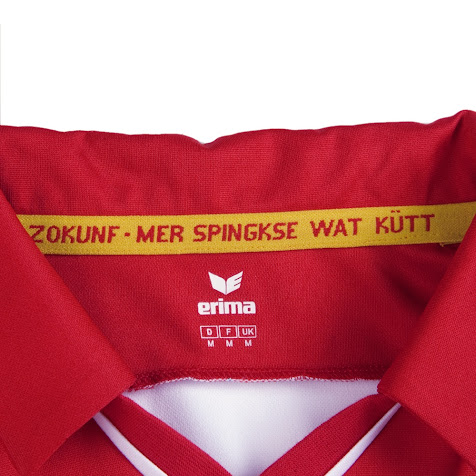 Das Trikot kostet 90 Euro und hat einen klassischen roten Kragen, während im Kragen der Schriftzug „Zokunf – mer spingkse wat kütt“ steht (Zukunft. Wir warten und sehen was passiert).