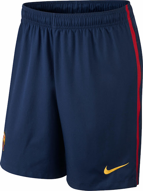 Das Qatar Airways Sponsorenlogo ist wieder weiß. Die Barcelona 14-15 Heimtrikot Hose ist dunkelblau mit einem gelben Nike Swoosh und roten Streifen auf beiden Seiten. Die neuen Barcelona 14-15 Heimtrikot Stutzen sind blau mit einem roten Streifen und einem roten Design auf der Hinterseite. Der Schriftzug Barca steht unterhalb des Nike Swooshs.