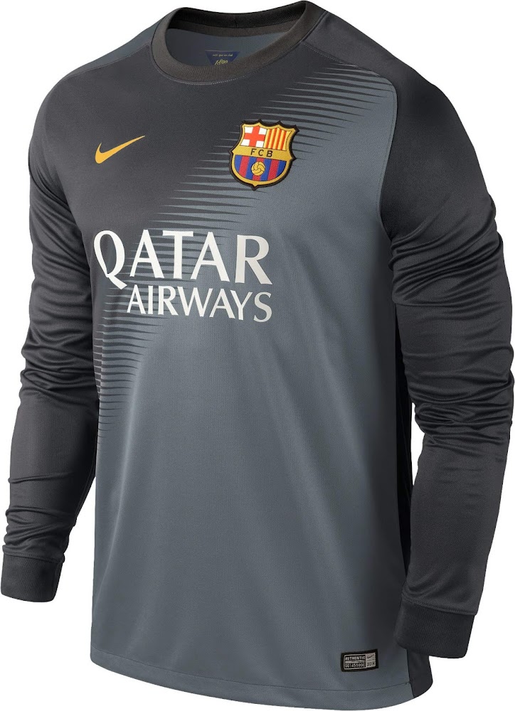 Das neue schwarz / graue FC Barcelona 14-15 Torwart Heimtrikot weist einen einzigartigen diagonalen Farbverlauf auf, der auch für das blaue FC Barcelona 14-15 Torwart Auswärtstrikot verwendet wird.