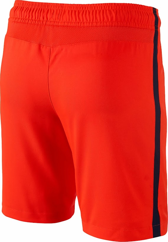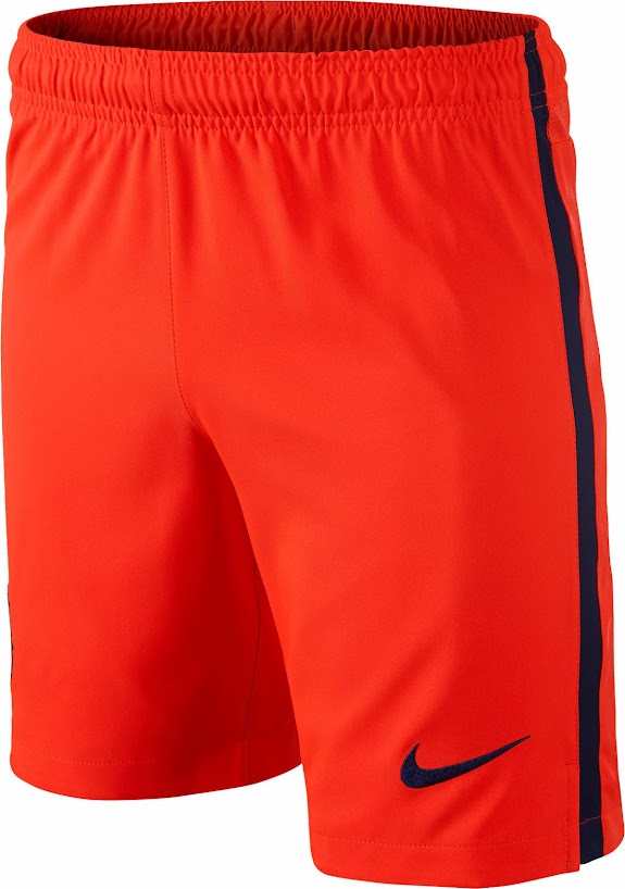 Die Hose des neuen Barcelona 14-15 Trikots ist orange und weist auf beiden Seiten einen blauen Streifen auf.