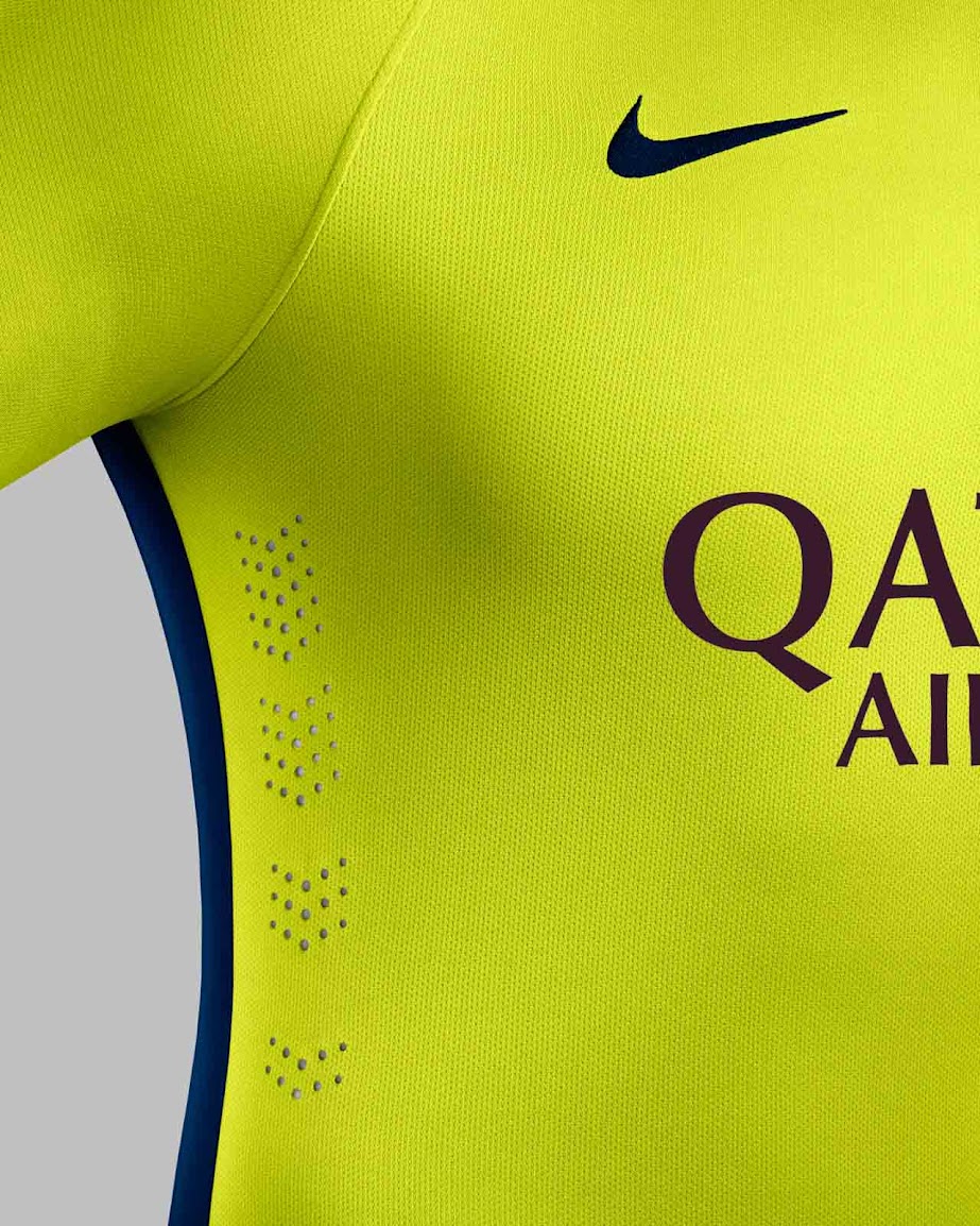 Der Nike Swoosh auf dem Barcelona 2014-2015 Auswärtstrikot ist blau, während das Qatar Airways Sponsorenlogo Lila ist.
