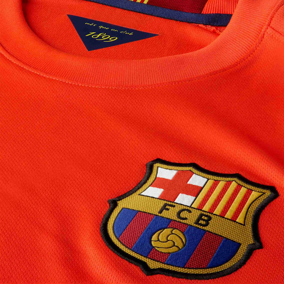Ähnlich wie die Trikots der Saison 2009-10 und von 1992 kommt auch das neue FC Barcelona 14-15 Auswärtstrikot mit der Hauptfarbe Orange, den jugendlichen Geist von La Masia einfangend. Es weist einen orangen Rundhalskragen mit einer katalanischen Flagge auf der Hinterseite auf, während die Ärmelenden blaue und rote Hälften aufweisen.