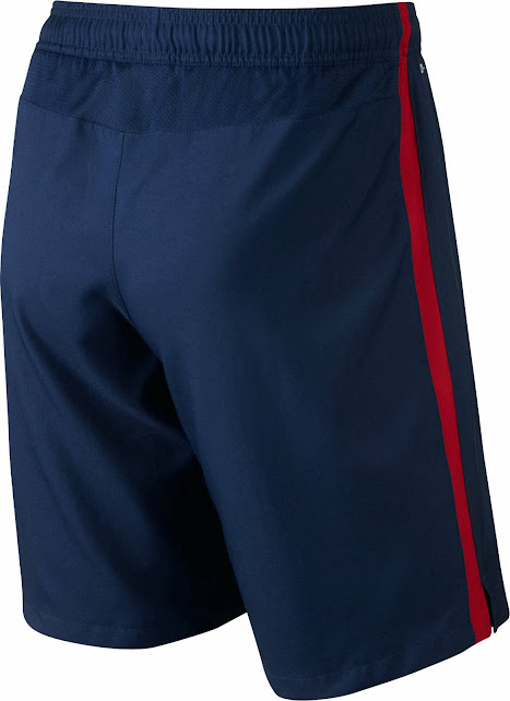 Das Qatar Airways Sponsorenlogo ist wieder weiß. Die Barcelona 14-15 Heimtrikot Hose ist dunkelblau mit einem gelben Nike Swoosh und roten Streifen auf beiden Seiten. Die neuen Barcelona 14-15 Heimtrikot Stutzen sind blau mit einem roten Streifen und einem roten Design auf der Hinterseite. Der Schriftzug Barca steht unterhalb des Nike Swooshs.