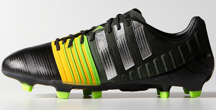Ähnlich wie die anderen Adidas 2014-15 Schuhe, kommt der Adidas Nitrocharge 2014 Next-Generation Schuh mit einem auffälligen Design. Der Schuh ist hauptsächlich schwarz mit auffälligen grünen und gelben Elementen.