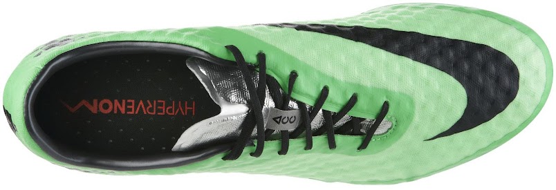 Der Nike Hypervenom Schuh hat genauso wie der grüne Nike Mercurial Vapor IX, der orange Nike CTR 2014 Schuh und der Nike Tiempo Legend V Fußballschuh eine silberne Zunge.