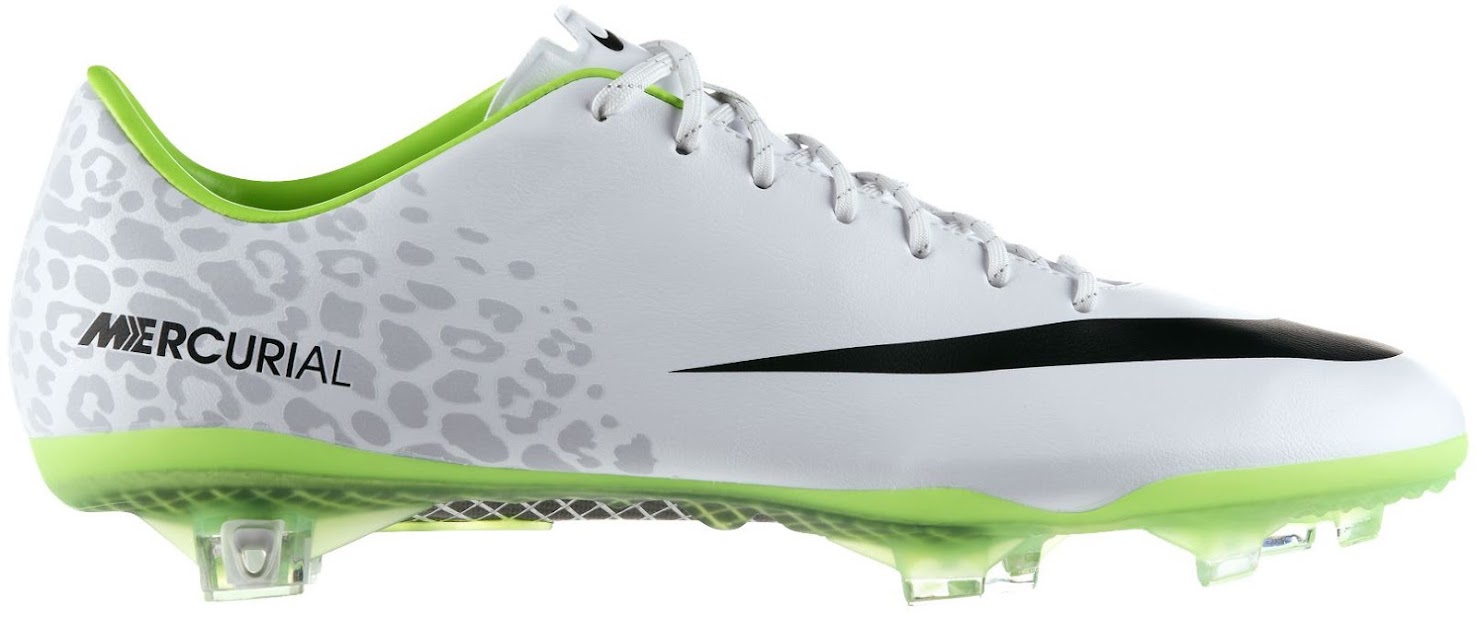 Der reflektierende Nike Mercurial Vapor IX Fussballschuh ist hauptsächlich weiß mit einem reflektierenden Muster auf dem Obermaterial, das einen Leoparden darstellt. Als Speed-Fussballschuh wird der Nike Mercurial Vapor IX Fussballschuh von Spielern wie Cristiano Ronaldo, Mario Götze oder Theo Walcott getragen.