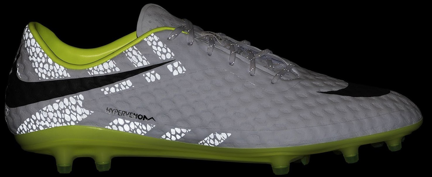 Der weiße reflektierende Nike Hypervenom Fussballschuh kommt in ähnlichen Farben wie der Mercurial Vapor IX Fussballschuh und hat eine grün Außensohle. Das den Nike Hypervenom Fussballschuh repräsentierende Tier ist eine tödliche Schlange, da der Nike Hypervenom Fussballschuh für die tödlichen Tore der ihn tragenden Stürmer bekannt ist.