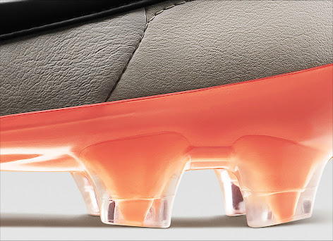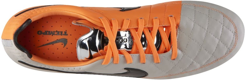 Ähnich wie die Oberseite des Nike Tiempo Legend V ist auch die Sohle in einen weißen und einen orangen Teil mit einem Farbverlauf von dünnen orangen Linien. Der neue Nike Tiempo Legend V hat größere Stollen als die letzte Generation der Nike Tiempo Fußballschuhe. Auf der Ferse des Nike Tiempo Legend V Fußballschuhes steht der Schriftzug Tiempo.