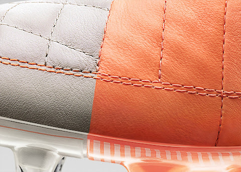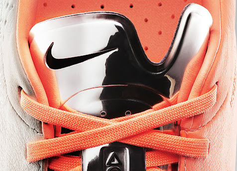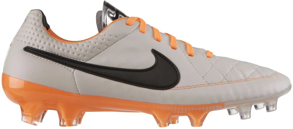Der Nike Tiempo Legend V Fußballschuh ist in zwei Farben geteilt. Die Innenseite des neuen Nike Tiempo V Fußballschuhes ist orange, während die Außenseite des Nike Tiempo Legend 5 Fußballschuhes weiß ist. Der Nike Swoosh ist auf beiden Seiten schwarz. Die Vorderseite des Nike Tiempo Legend V Fußballschuhes ist aus Leder hergestellt, während der hintere Teil mit der Nike Hypershield Technologie kommt.