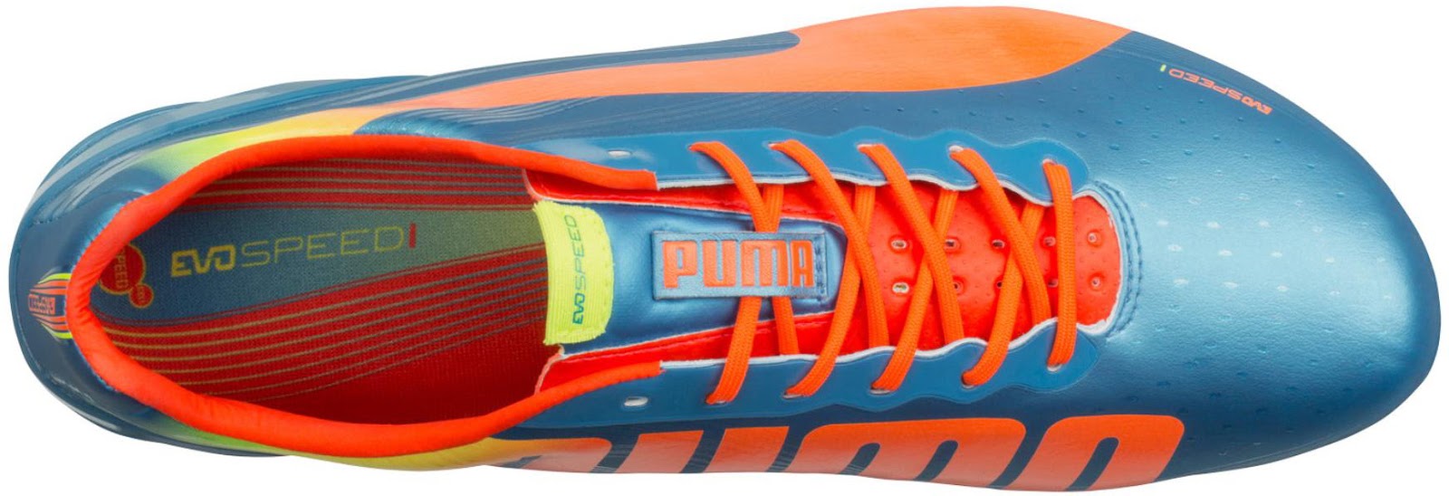 Die neuesten Puma evoSPEED Fußballschuhfarbvarianten vereinen auffällige und sehr kontrastreiche Farben wie auch bei der neuen Puma evoSPEED 1.2 2014 Fußballschuhfarbvariante in Blau/Orange/Gelb. Der Puma Schriftzug auf der Innenseite des Schuhes ist orange mit einem Farbverlauf zu gelb, während der Schuh hauptsächlich blau ist.