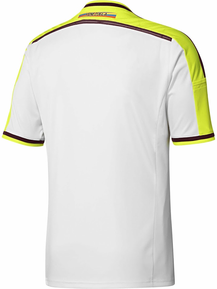 Das neue Venezuela 2014-2015 Auswärtstrikot ist weiß mit gelben und dunkelroten Elementen. Während das Venezuela 2014 Auswärtstrikot auf dem Adidas Condivo 14 Template basiert, sind die Farben nicht aus dem Katalog. Die Logos und Streifen sind dunkelrot, während die Oberseite der Ärmel, die Schultern und der obere Rückseitenbereich hauptsächlich gelb sind. Das neue Venezuela Auswärtstrikot hat einen halb roten, halb gelben V-Kragen, genauso wie bei den Ärmelenden. Auf der oberen Rückseite unterhalb des Kragens des Venezuela 14-15 Auswärtstrikots ist ein Flaggenelement mit dem Schriftzug Venezuela.