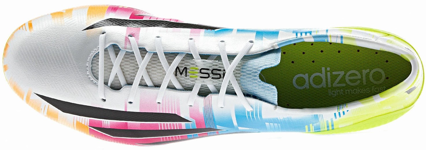 Die Sprintframe Sohle ist grün, während die Stollen rosa sind. Der neue farbenprächtige Adidas Adizero Messi Fußballschuh wird bis zu der WM 2014 getragen, aber nicht in Brasilien. Messi wird eine spezielle weiß/blaue Argentinien Farbvariante für die WM erhalten.