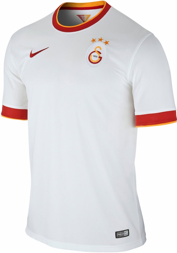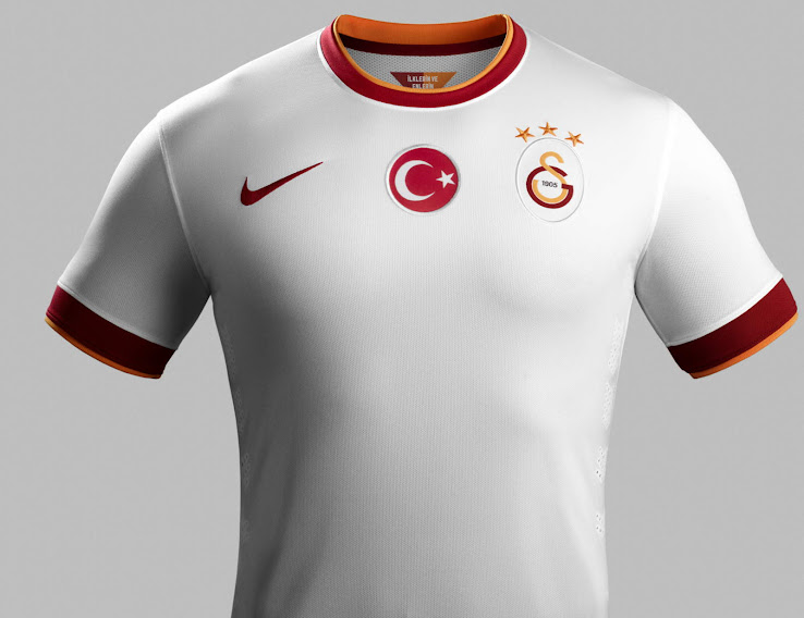 Das Galatasaray 14-15 Auswärtstrikot ist weiß mit einem rot / orangen Kragen und rot / orangen Ärmelenden. Das Trikot wurde von dem ersten weißen Trikot aus dem Jahre 2000 inspiriert, dem Jahr der größten Erfolge Galatasarays, national und international.