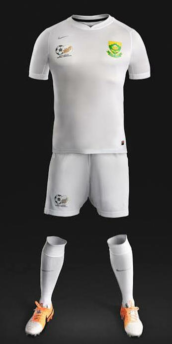 Das Bafana Bafana 2014 Auswärtstrikot ist hauptsächlich weiß mit einem silbernen Nike Swoosh und wird mit einer weißen Hose und weißen Stutzen kombiniert. Die südafrikanische Flagge ist unterhalb des Kragens auf der Rückseite platziert.