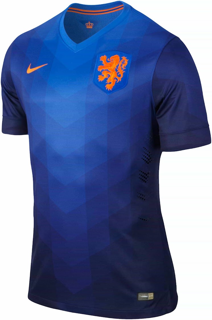 Die Hose des neuen Niederlande 2014 Auswärtstrikots wird ein dunkleres Blau mit orangen Applikationen haben, die Stutzen werden auch blau sein.