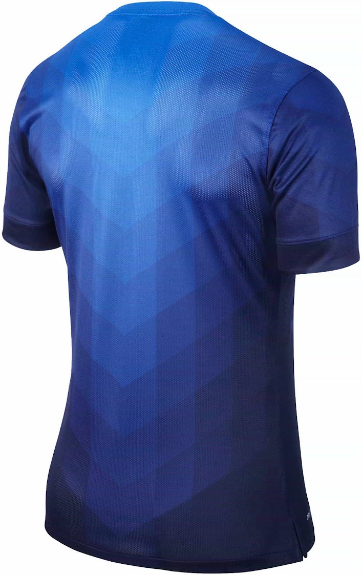 Das neue Niederlande 2014 WM Auswärtstrikot hat ein klassisches oranges Niederlande Wappen und die Hauptfarbe ist ein dunkles Blau. Der V-Kragen des Auswärtstrikots ist blau, während die Ärmelenden einen auffälligen orangen Innenteil haben.