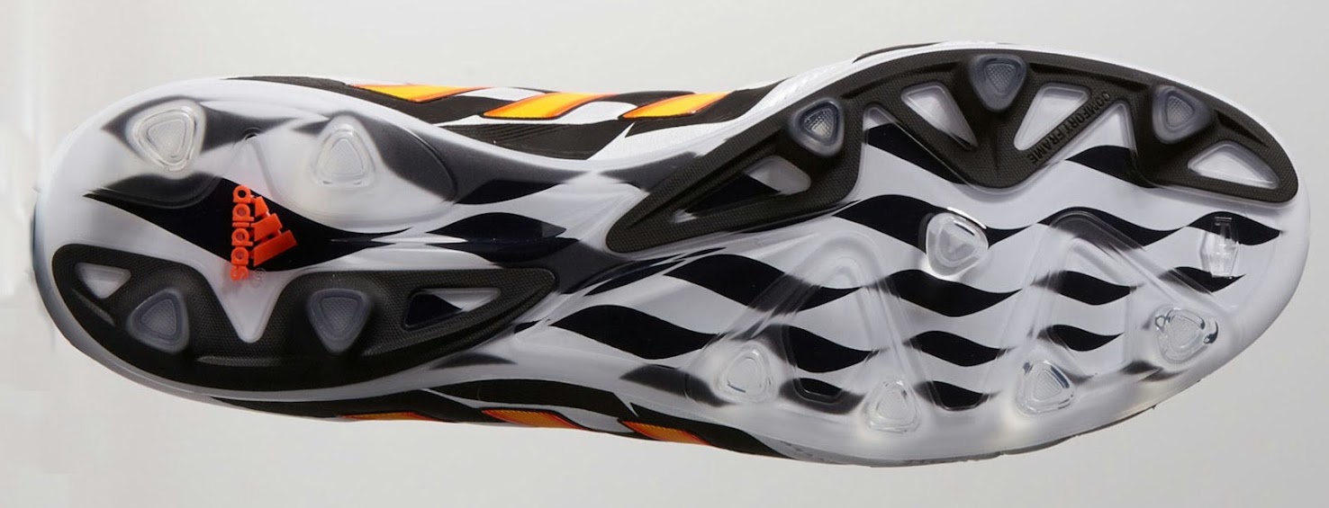 Der Adidas Adipure 2014 WM Fußballschuh kommt mit einem welligen Muster auf der Oberseite. Die drei Adidas Streifen sind orange, während die Innensohle die Nummer 14 für das Jahr der WM aufweist. Das Muster wird auch für die neuen Adidas Adipure 2014-2015 Farbvarianten verwendet, auch wenn es nicht das gesamte Schuhdesign bedecken wird.