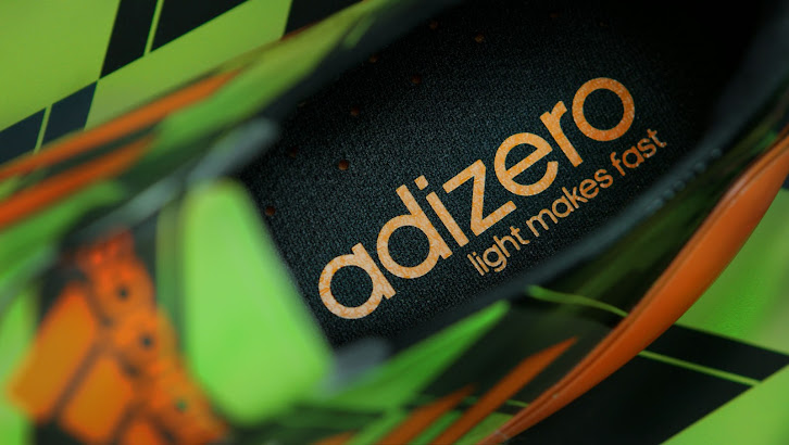 Mehr Details des Fußballschuhs: Auf der Ferse des Adidas Adizero Schuhes taucht der Schriftzug Adizero Crazylight auf, anstatt der vorherigen, grünen Nummer 99. Auf der Zunge ist ein oranges Adidas Logo, das umgedreht wurde, um nach vorne zu zeigen. Auf der Innensohle steht der Schriftzug "adizero light makes fast".