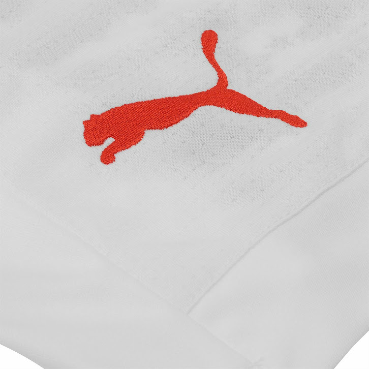 Das eher simple Trikot weist einige gelbe Designelemente auf, während das Puma Logo auf der Vorderseite und den Ärmeln rot ist. Innerhalb des Kragens ist eine Nature of Believing Grafik.