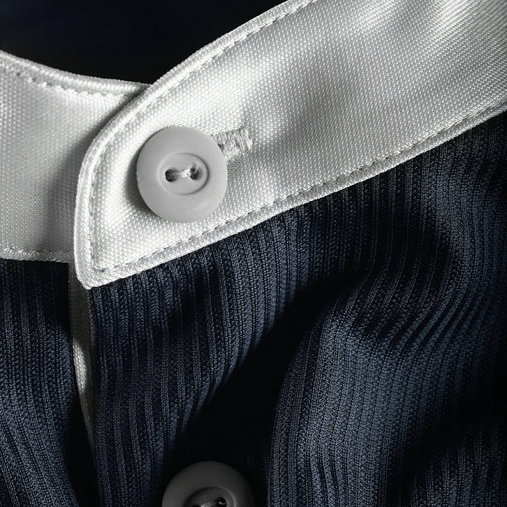 Das Olympique Lyon 2014-2015 Ausweichtrikot ist hauptsächlich dunkelblau (fast schwarz) mit dunkelgrauen Nadelstreifen. Der klassische Henley Trikotkragen ist weiß, während das Trikot blaue und rote Details auf der Seite des Trikots aufweist.