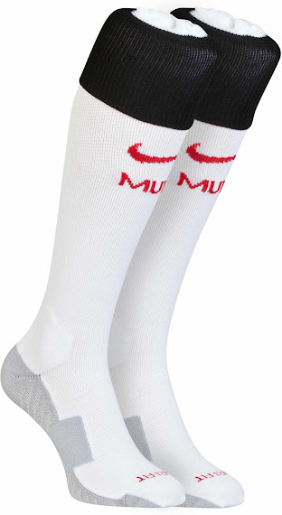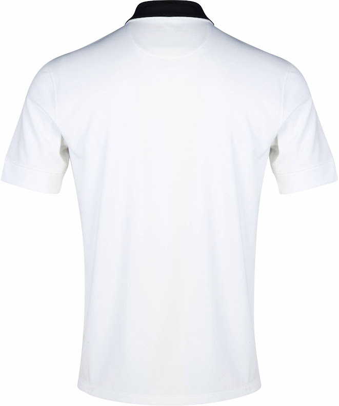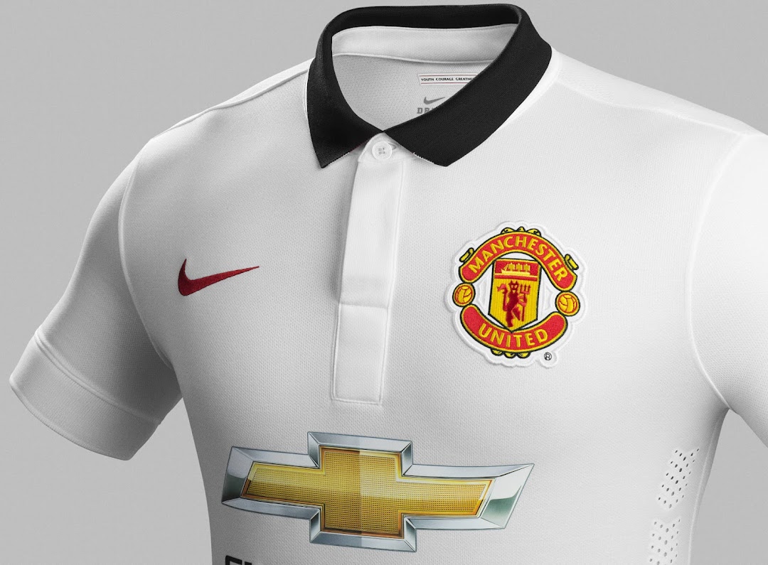 Das neue Manchester United 14-15 Auswärtstrikot ist größtenteils weiß mit einem auffälligen schwarzen Polokragen, der einen unauffälligen Teufel aufweist. Der Nike Swoosh des neuen Manchester United 2014-2015 Auswärtstrikots ist rot.
