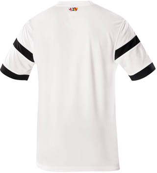 Das neue Freiburg 14-15 Auswärtstrikot basiert auf dem Nike Trophy II Template in der weißen und schwarzen Variante. Das Freiburg 2014-15 Auswärtstrikot ist weiß mit einem V-Kragen, während es zwei schwarze Streifen auf beiden Ärmeln aufweist. Auf der oberen Rückseite des Freiburg 14-15 Auswärtstrikots ist ein Grafikdesign, das das Freiburg Wappen, die Flagge von Baden und die Flagge der Stadt Freiburg aufweist.