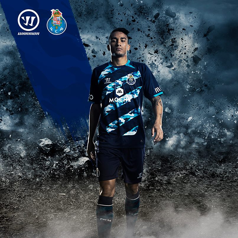 Der einzigartige Trikotkragen kommt mit hellblauen Applikationen, die auch Teil der dunkelblauen Ärmel sind. Der Schriftzug FC Porto ist auf der Rückseite des Trikots platziert, während das Warrior Logo weiß ist.
