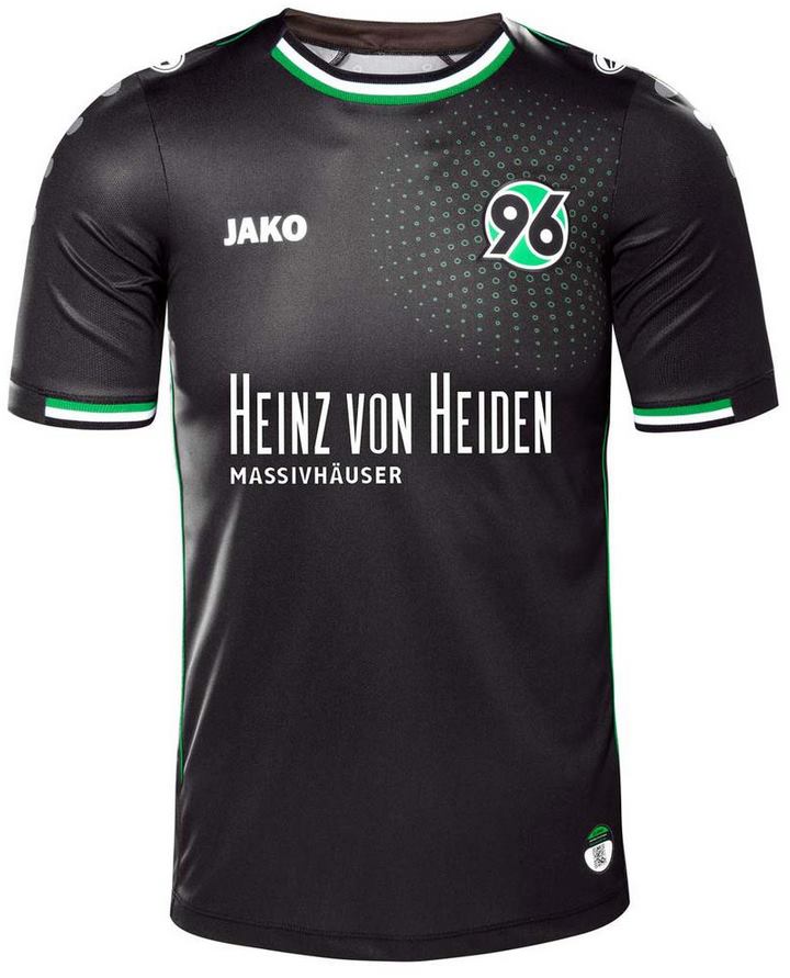 Das neue Hannover 96 14-15 Auswärtstrikot ist schwarz mit gepunkteten Kreisen um das Hannover 96 Wappen herum, während das Sponsorenlogo und die Applikationen weiß sind. Der Trikotkragen und die Ärmelenden weisen grüne Designelemente auf.