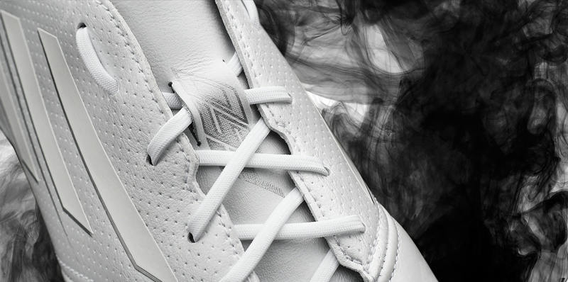 Das Taurus Leder Obermaterial des weißen Adidas Adizero F50 Leder Schuhs wurde für ultimative Ballkontrolle hergestellt, während das Speedfoil Material auf der Ferse durch synthetisches Leder ersetzt wurde.