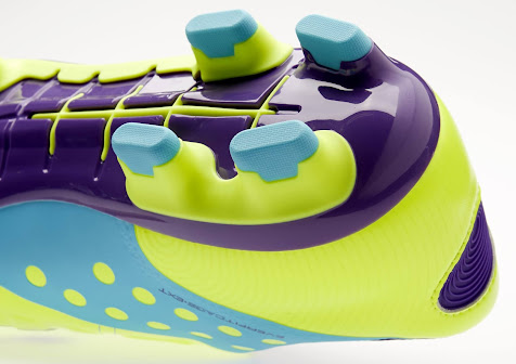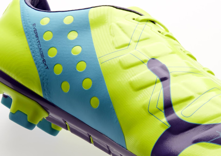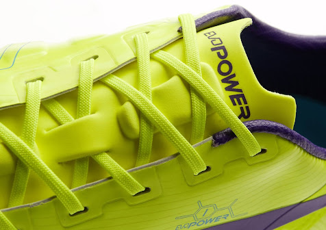 Die AdapLite Oberseite des neuen 2014-2015 evoPOWER Fußballschuhes ist hauptsächlich Gelb, während die Puma Markenzeichen Lila sind. Der Hellblaue außenliegende EverFit Cage auf der Innenseite des Schuhes wurde für mehr Biegsamkeit und Stabilität hergestellt, während die extrem weiche Fersenkonstruktion den Druck auf die Achillesferse (Lila) reduziert.