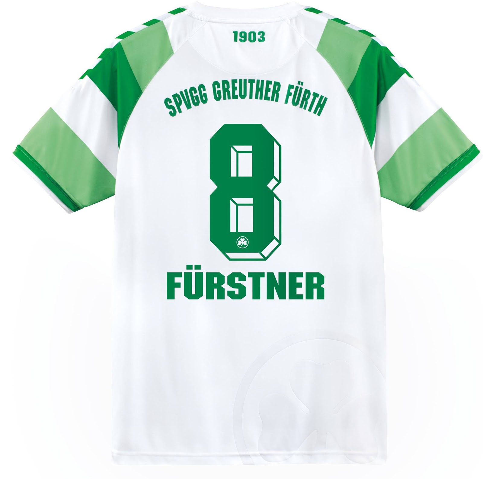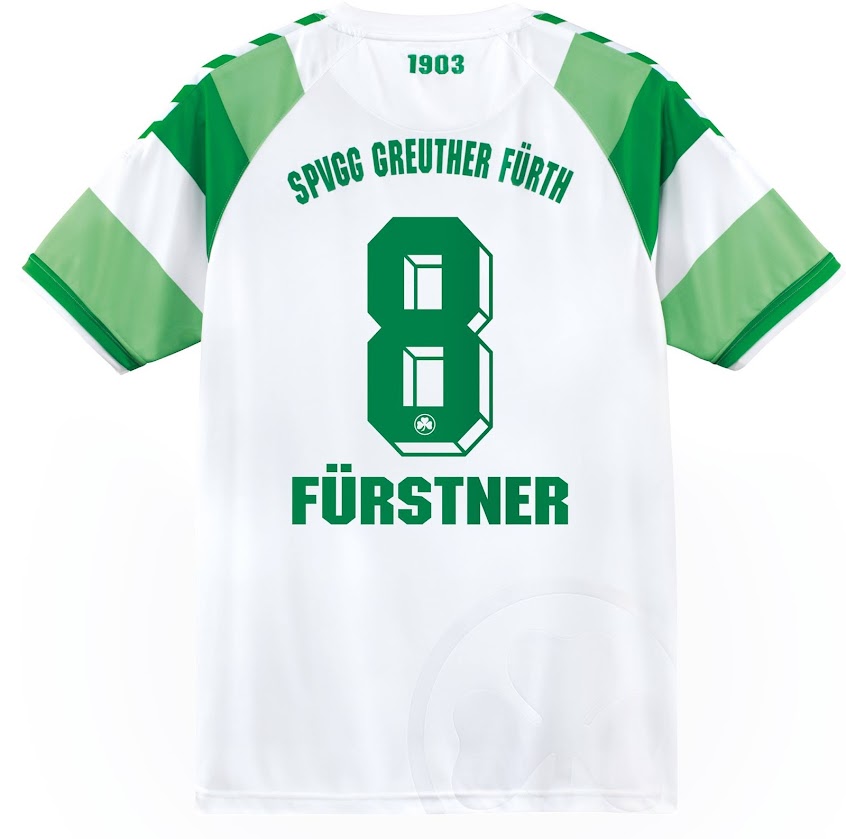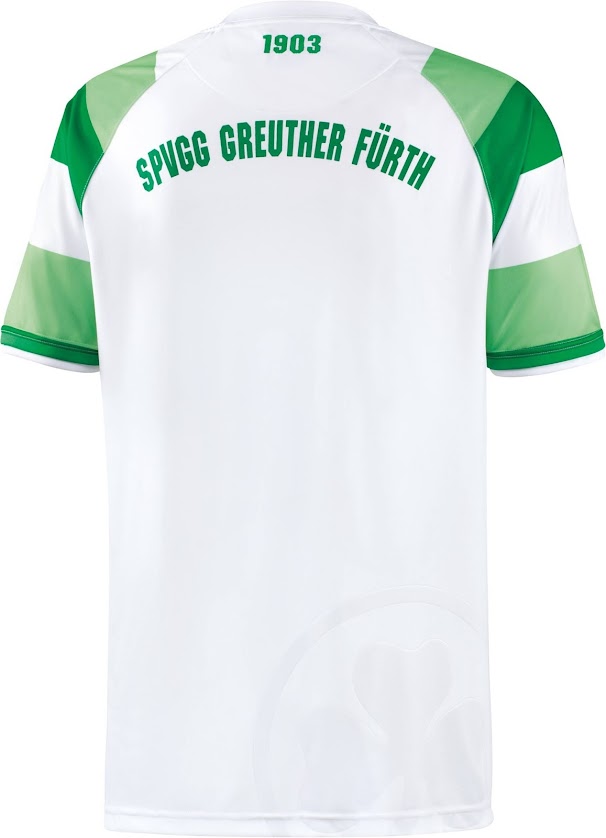 Innerhalb des einzigartigen weiß / grünen Kragens steht der Schriftzug SpVgg Greuther Fürth, während das Gründungsjahr 1903 auf der Rückseite unterhalb des Kragens des neuen Greuther Fürth 14-15 Trikots platziert ist. Die neuen Fürth Trikots weisen eine klassische Schriftart auf.