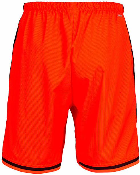Die Hose des neuen Fulham 14-15 Auswärtstrikots ist orange, während die Stutzen schwarz sind.