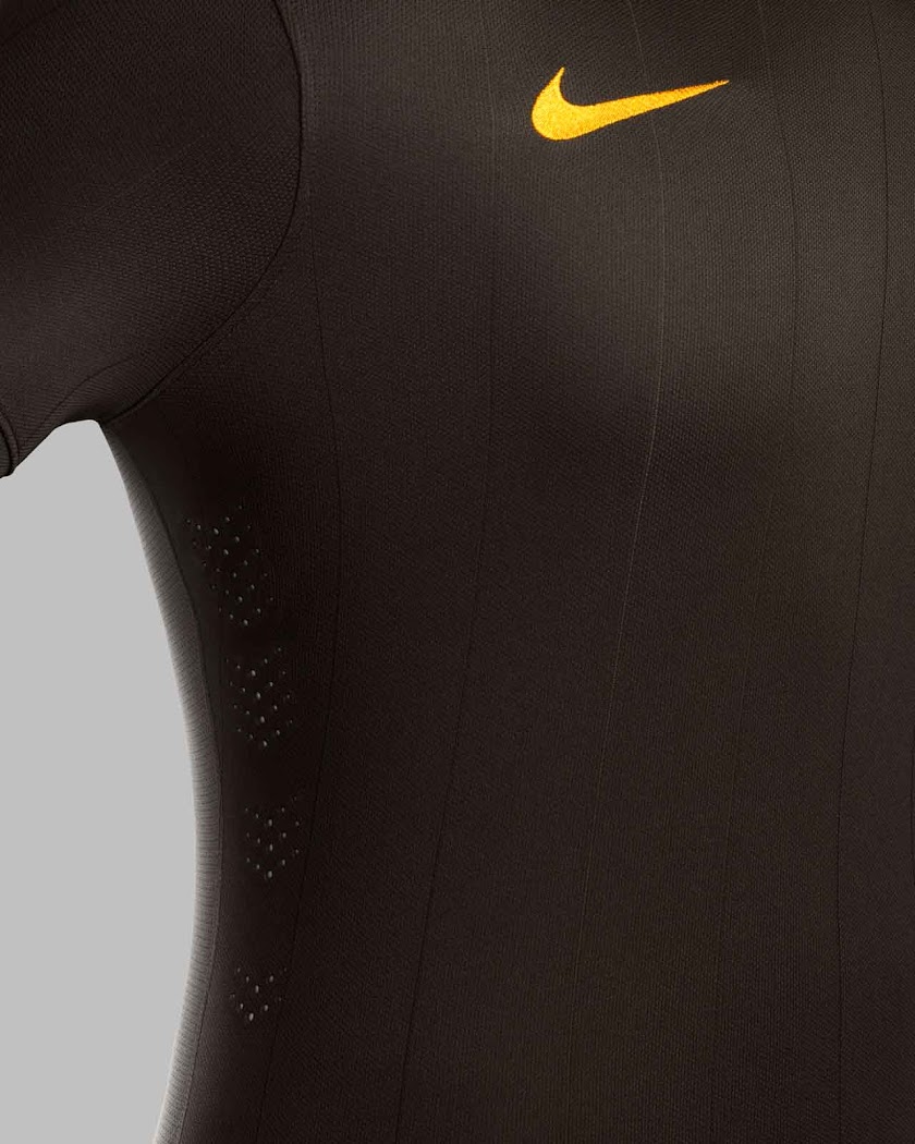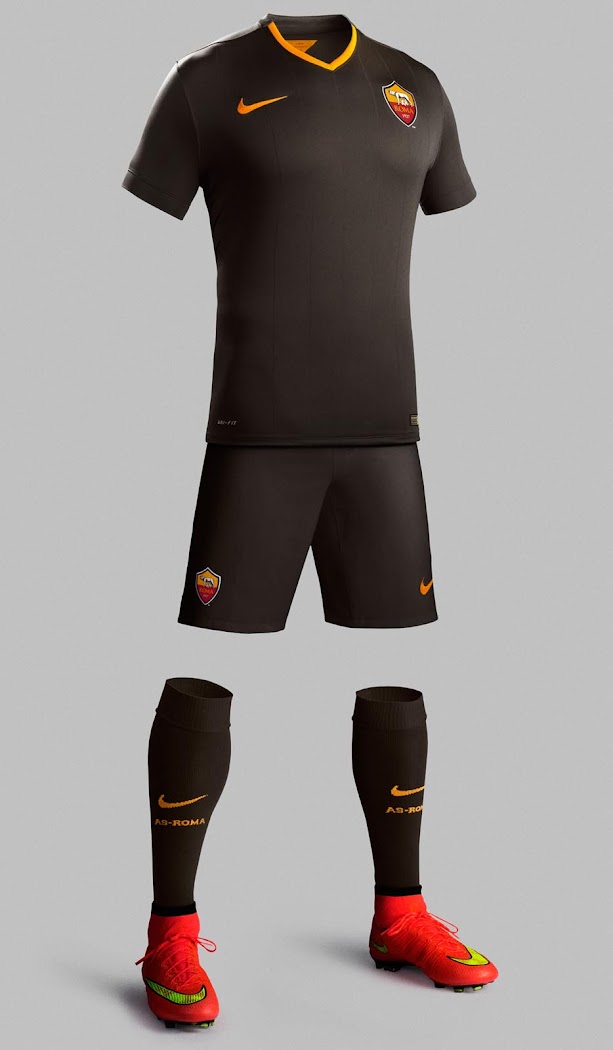 Das neue Nike AS Rom 2014-15 Ausweichtrikot ist dunkelbraun mit dunkelgrauen vertikalen Nadelstreifen, die auch für das neue AS Rom Heimtrikot verwendet werden. Der V-Kragen ist orange / schwarz, basierend auf dem selben Kragen, der für das neue AS Rom 14-15 Auswärtstrikot entworfen wurde.